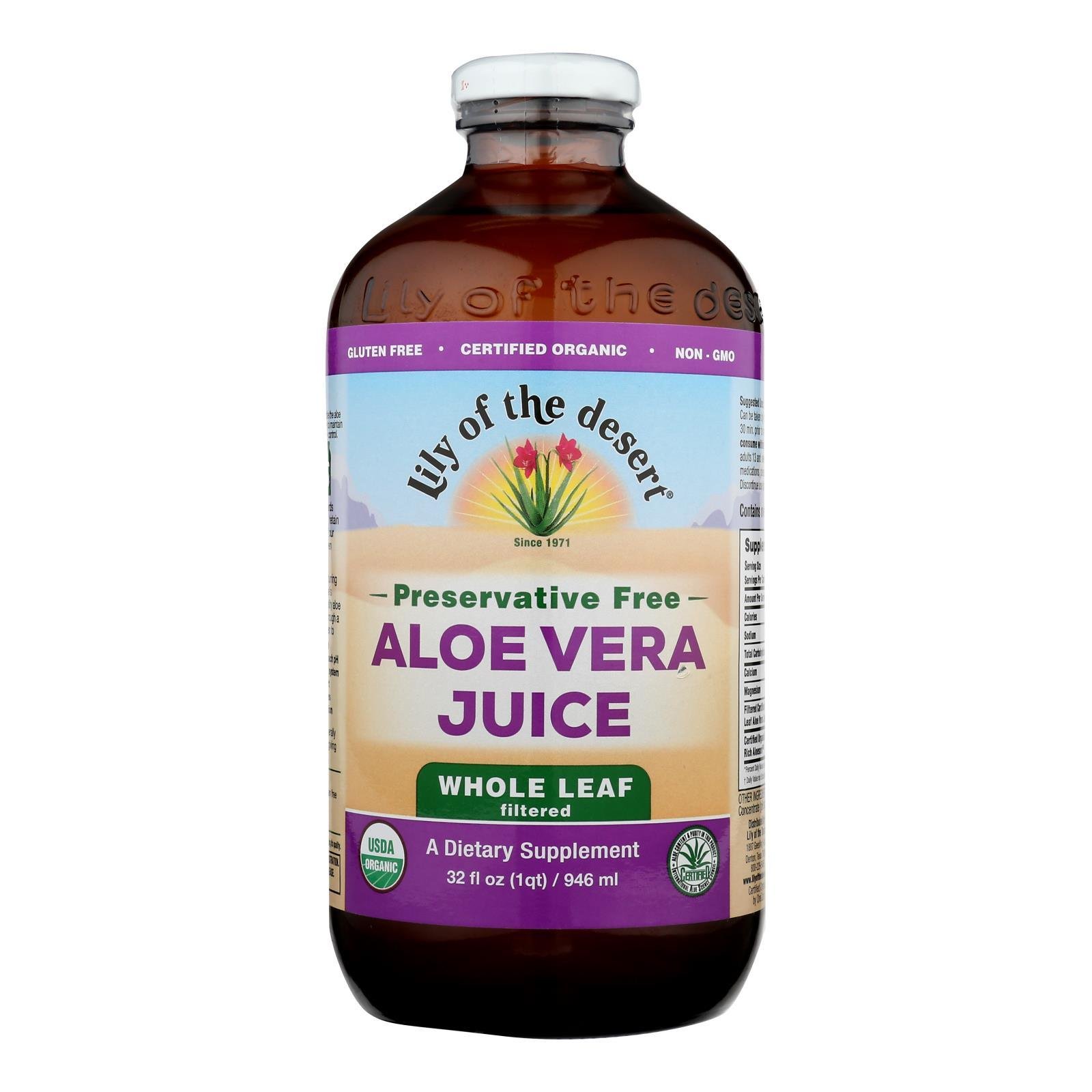 Lily of the desert preservative free whole leaf aloe vera juice is made from certified usda organic ingredients including 99% aloe vera juice rich in antioxidants. One 32 oz. Bottle of lily of the desert is a kosher dietary supplement with 35 mg. Of calcium per serving to help support a healthy immune system and digestive regularity.