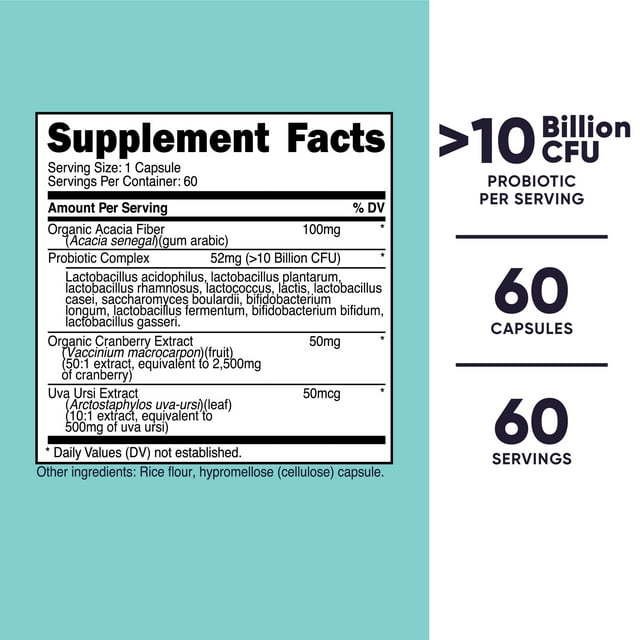 Nutricost's Probiotic for Women provides 60 capsules with >10 Billion CFU each. In addition to the complete probiotic complex, this supplement contains organic acacia fiber, organic cranberry extract, and uva ursi extract. One capsule is one serving.